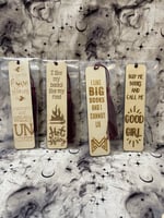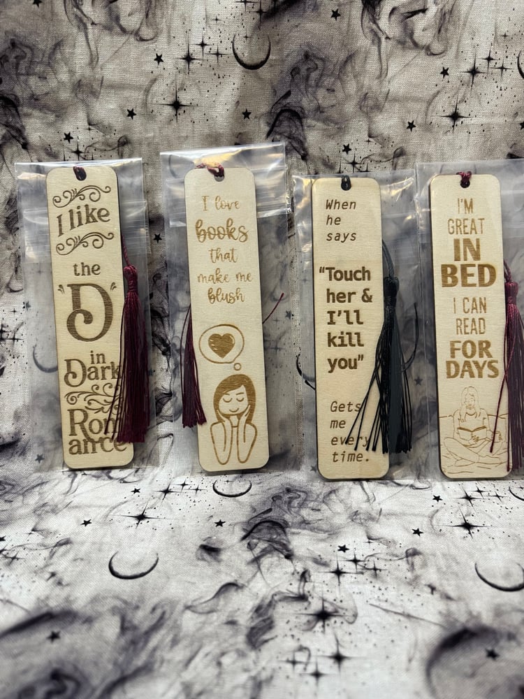 These bookmarks are wood engraved. Perfect for those dark romance/smit fan. They are available individually or as n a mystery pack of 4